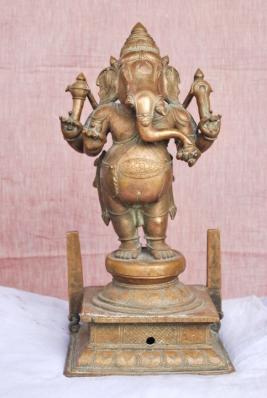 | Description / विवरण | Standing on padma peetam with four hands. Upper hands carry Ankusa and Pasa. Lower right hand holds a broken tusk and the left hand holds a fruit. The trunk touches the fruit. Karanda makuta adorn the head. |