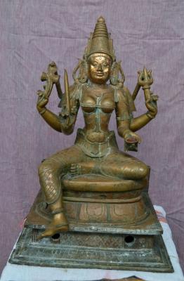 | Description / विवरण | Devi sitting on padma peetam with left leg folded and the right leg in hanging position. Having four hands. Upper hands carry Damaru and Sula. Lower hands carry sword and Kapala. Wearing Pathra kuntalam in the ears and Karanda makutam on the head. Wearing Kuzha bhanda. |