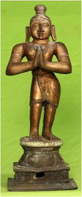 | Description / विवरण | Standing on padma peetam with anjali hastha posture. Bun shaped hair dress on the head. |