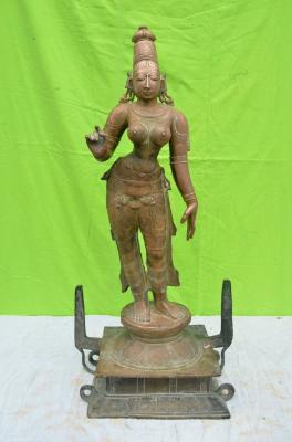 | Description / विवरण | Standing in tribanga posture on the padma peetam. Wearing karanta makuta. 2 hands in kataka mutra and lola hastha. Devoid of kuja bhanda |