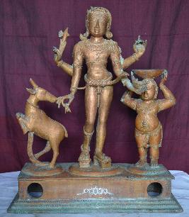 | Description / विवरण | Standing on a rectangular peetam in Nirvana pose. Having four hands. Upper hand carry a pas and in kataka mudra. Lower right hand hold a kapala and the right hand hold a piece of food for the deer standing to the right of him. A boothgana carrying a begging vessel on its head stand to the left. A snake adorns the hip like a belt. Wearing wooden padaraksha. |