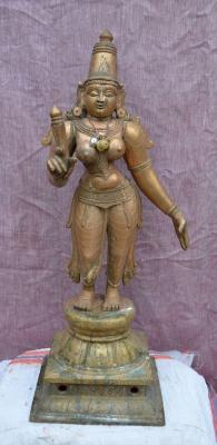 | Description / विवरण | Standing on padma peetam with two hands in Tribhanga position. Right hand carry flower and the left hand in lola hastha posture. Wearing karanta makuta on the head. Devoid of kujha bhanda. |