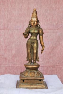 | Description / विवरण | Standing on padma peetam with two hands. The right hand in kataka mudra and the left hand in lola hastha pose. Karanta makuta on the head. |