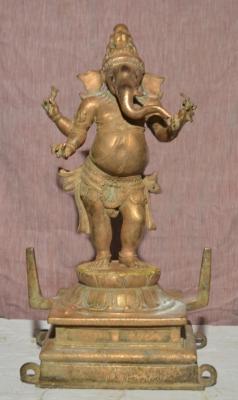 | Description / विवरण | Vinayagar standing on padma peetam with four hands. Upper hands carry Ankusa and Pasa. But both are broken at the top. Broad ears. Wearing Karanta makuta on the head. The mode of dressing in the waist ended with big knots. On either side keerthi mugha is present in the waist band. |