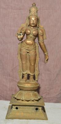 | Description / विवरण | Standing on Urdhava padma peetam with two hands. Right hand in a position to hold a flower and the left hand in lola hastha posture. Jata makuta on the head. |