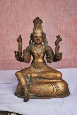| Description / विवरण | Sitting on padma peetam with left leg folded and the right leg in hanging position. Four hands. Upper hands carry axe and a deer. Lower hands are with Abhaya and kadaka Mudra poses. Jata Makutam on the head. |