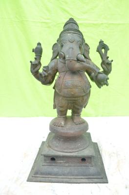 | Description / विवरण | Standing in abanga on the padma peetam. 4 hands parasu, pasa, tusk and motaga. Trunk touching the motaga. Lower garment up to knee. |