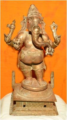 | Description / विवरण | Standing on padma peetam with four hands. Upper hands with Ankusa and Pasa. Lower hands with a broken tusk and holding a fruit. Wearing karanta makutam on the head. Waist band is highly decorated. |