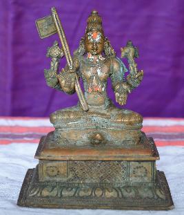 | Description / विवरण | Sitting in a sugasanam posture on a Tortoise which is on a square peetam. Four hands. Upper hand carrys chakra and counch. Lower handare in Vygyana and Varadha mudras.A Thirithandam rest on the right shoulder whioch is detachable.Wearing Karanda Makutam |