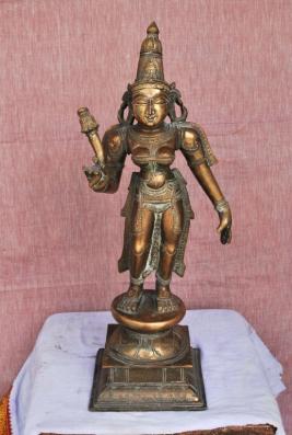 | Description / विवरण | Standing on padma peetam with two hands. Right hand carry flower and the left hand in lola hastha posture. Jata Makuta on the head. |