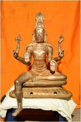 | Description / विवरण | Seated on padma peetam with left leg folded and the right leg in hanging position. Having four hands. Upper hands carry Mazhu and deer. Lower hands are in Abhaya and Varadha mutras. Wearing Makara kuntalam on the ears and Jata makutam on the head. |