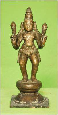 | Description / विवरण | Skanda is standing on Padma Peetam. Two hands. Carry flowers. Karauda Makuta on the head. |
