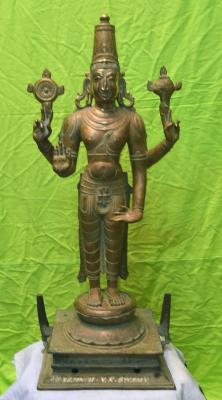 | Description / विवरण | Vishnu standing on padma peetam with four hands. Upper hands carry Chakra and conch. Lower right hand in Abhaya and the left hand rests on a Gada Mace placed near his left foot. Wearing Makara kuntalam |