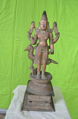 | Description / विवरण | Standing on the padma peetam with four hands. Upper hands carry sakthi and vajra. Lower hands are with Abhaya and the left hand in a posture of resting on a gathayudam But, the ayudam is not found. |