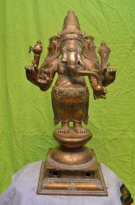 | Description / विवरण | Standing on padma peetam with four hands carry Ankusa and Pasa. Lower right hand with a broken tusk and the left hand with a fruit. Wearing karanta makuta on the head. |