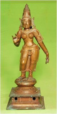 | Description / विवरण | Standing on Padma Peetam. Two hands. Right hand in Kadaha hastha and left hand in Lola hastha posture. Wearing Karanda Makuta on the head. |
