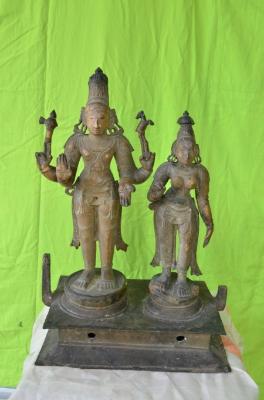| Description / विवरण | Siva standing on the padma peetam. Four hands. Upper hands carry Mazhu and deer. Lower hands in Abhaya and Varadha posture. Devi standing left to siva in Abhanga pose. Two hands are in kataka and lola hastha poses. |