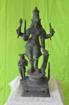 | Description / विवरण | Standing on padma peetam in Tribhanga style.. Having four hands. Upper hand carrys a flower and Deer horn. Lower hands carry a knife on the right and placing a thick sword on top of a beheaded Asura. To his right a gana vahana standing in Anjali posture. |