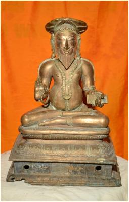 | Description / विवरण | Seated on padma peetam with Padmasana pose. Having two hands. The right hand with Vyagna mutra with rudraksha bead garland and the left hand with a palm leaf manuscript. Long ornament decorated on the chest. Long ears. The face is with beard. The head adorned with flat hair dress. |