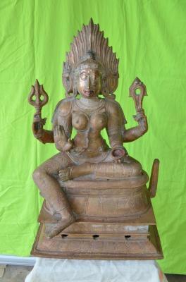 | Description / विवरण | Devi sitting on the padma peetam. Her left leg folded and the right leg hanging down. Four hands. Upper hands carry a choolam and a Pasa. Lower hands are with Abhaya mudra and a kapala. Wearing Jwala makuta. |