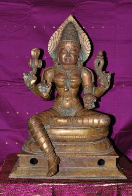 | Description / विवरण | Devi sitting on Padma peetam with left leg folded and the right leg in hanging position. Having four hands. The upper hands carry Drum and Pasa. Lower hands are with Kataka Mudra and holding Pasa. Head dress is decorted with karanda makuta with flame decoration. |