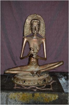 | Description / विवरण | Sitting on padma peetam with folded legs. Two hands holding the musical instrument Tala. Upper portion of the body is without any dress. Jata bharam hair dress on the head. |
