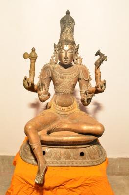 | Description / विवरण | Siva sitting on padma peetam. His left leg folded and the right leg in hanging position. Four hands. Upper hands carry mazhu and deer. Lower hands are in Abhaya and kataka mudras |