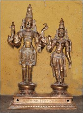 | Description / विवरण | Pradosha Nayakar. Siva and uma standing on Padma Peetam over rectangular Peedam. Siva with four hands with usual gestures. Uma is in the left side. Two hands. Right hand carries flower and left hand in Lola hastha posture. |
