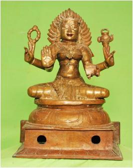 | Description / विवरण | Sitted on Padma Peedam Sukasanam Posture. Four hands. Upper hands with Aksha mala and Kamandala. Lower hands with Abaya and Palm leaves manuscripts. |