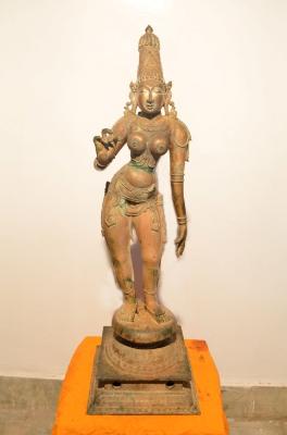 | Description / विवरण | Standing on padma peetam in Tribhanga style. Two hands. Right hand in kataka mudra and the left hand in lola hastha posture. Wearinh Kirita makutam. Lower garments from the waist. |