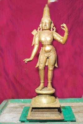 | Description / विवरण | Standing on padma peetam with two hands. Left hand in a position to hold a bow and the right hand in a position to hold the arrow. On the back of the right shoulder, a basket for holding the arrows is seen. |