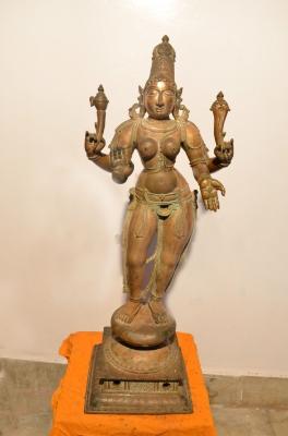 | Description / विवरण | Standing on pada peetam in Tribhanga style. Body leaning more to her left side. Four hands. Upper hands carry Ankusa and pasa. Lower hands are in Abhaya and Varadha posture. Prominent ear lobes. Wearing Kirita makutam. |
