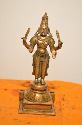 | Description / विवरण | Standing on padma peetam. Four hands. Upper hands hold vajram. Lower hands are in Abhaya and varadha pose. Wearing Karanda makuta. Lower garments from the waist. |