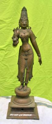 | Description / विवरण | Devi standing in Tribhanga style on the padma peetam with two hands. Right hand with flower and the left hand in lola hastha pose. Wearing karanta makutam on the head. |