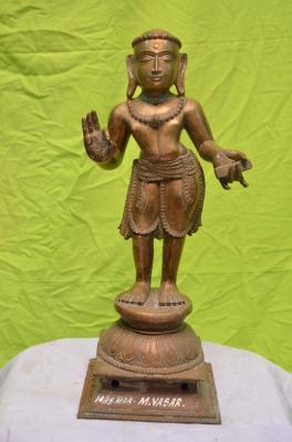 | Description / विवरण | Standing on padma peetam with two hands. Right hand with Vyagna mudra and the left hand carry a palm-leaf manuscript. Wearing Rudraksha garland on the head and in the neck. The waist dress is higly decorative. |