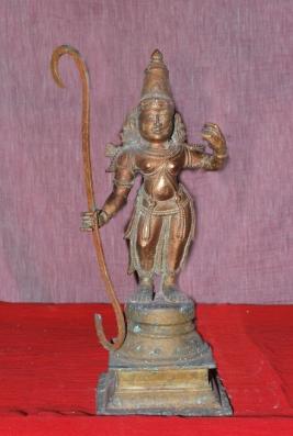 | Description / विवरण | Standing on padma peetam with two hands. The right hand is in a position to hold a bow and the left hand is in the posture to hold an arrow. Here, the icon of Arrow is missing. |