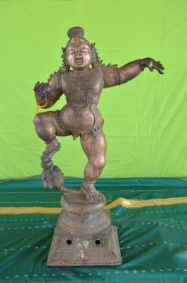 | Description / विवरण | Dancing on padma peetam with the right leg rests on flower. Two hands. Right hand hold butter ball and the left hand in dancing posture. Bun shaped hair dress. As a small child, nude and wearing bell garland in the waist. |