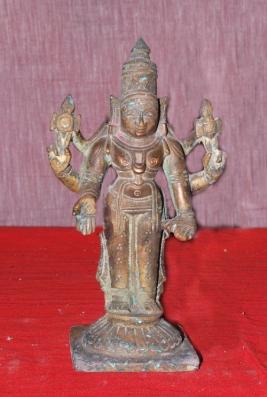 | Description / विवरण | Standing on padma peetam withg four hands. The upper hands are with Chakra and Conch. The lower right hand is in varadha mudra and the left hand in a position to place it on a mace gadayudam which is missing. |