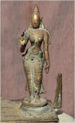 | Description / विवरण | Standing on padma peetam over the rectangular pedestal with Siva. Two hands are in kataka and lola hastha poses. Wearing karanta makutam on the head. The waist band is decorative and the dress extended up to knee. |