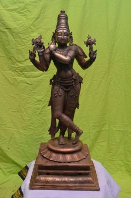 | Description / विवरण | Standing with crossed legs on Urdhva padma peetam with four hands. Upper hands carry Chakra and conch. Lower hands are in a position to hold a flute. Wearing Makara kuntalam on the ears and kirita makuta on the head. Dress from the waist is with decorations and extended upto the feet. |