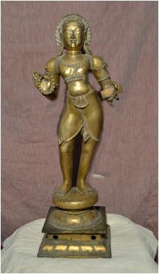 | Description / विवरण | Standing on padma peetam with two hands. The right hand is with a rudraksha garland and the left hand having a palm leaf manuscript. The head dress is in jatabara shape. |