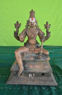 | Description / विवरण | Vishnu sitting on the padma peetam. His left leg folded and the right leg in hanging position. Four hands. Upper hand carrys Chakra and Counch. The lower right hand in Abhaya mudra and the left hand holds a gadayudam. Wearing Kirita makuta. |