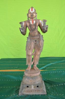 | Description / विवरण | Standing on the padma peetam in Tribhanga style. Two hands holding Talas the musical instruments. Peculiar Kiritam which fits in to his head.Ornaments on the chest. Lower garments. |