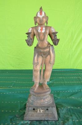 | Description / विवरण | Standing on padma peetam. Two hands hold tala-musical instruments. Rudraksha mala on the chest. Lower garments. |
