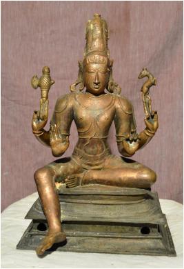 | Description / विवरण | Sitting on padma peetam with left leg folded and right leg in hanging position. Four hands. Upper hands with axe and deer. Lower hands with Abhaya and Varadha pose. Jata makutam is on the head. |