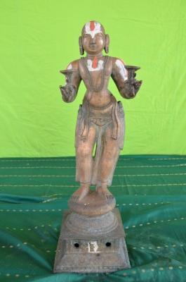 | Description / विवरण | Standing on padma peetam. Two hands holding the musical instrument Tala. Long ears. Rudraksha mala on the chest. Lower garments. |