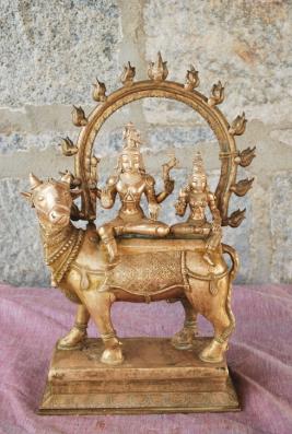 | Description / विवरण | Siva and Parvathi sitting on the bull Rishabha which is standing on a rectangular pedestal. Siva is with four hands. Upper hands carry axe and deer. Lower hands with Abhaya and Varadha poses. Wearing Jata Makutam on the head. Uma is sitting by his left side with two hands. Right hand carry flower and left hand rests on the leg. |