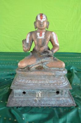 | Description / विवरण | Sitting on padma peetam in Padmasana. Two hands. The right hand in Vyagna mudra where as the left hand in Dyana mudra. Shavened head. Wearing rudraksha mala on his chest. |