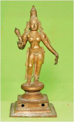 | Description / विवरण | Standing on Padma Peedam. Right hand with flower and left hand in Lola hastha posture. Karanda Makuda on the head. |