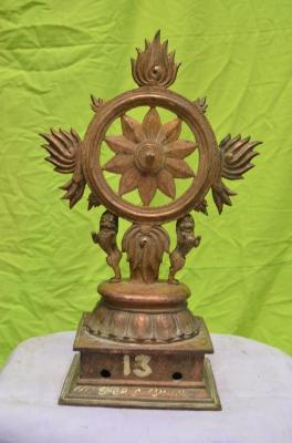 | Description / विवरण | Chakram fixed on the padma peetam. Big four flame motifs and small four flames are found in the circle. The circle is supported by two lions on either side. |